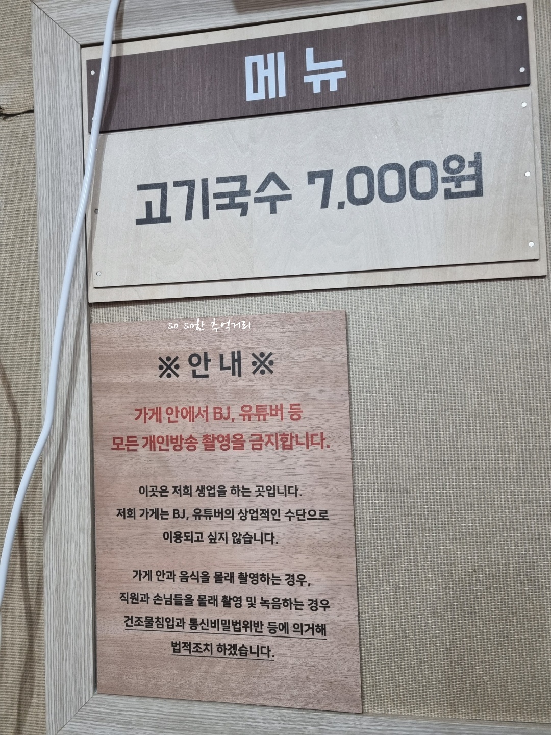 메뉴는 오직 고기국수 단 1개이다. 아마도 여기서 생방송 유튜브를 진행하시는 분들이 있었는지 이런 경고문이 붙어 있었다. 그래서인지 사진 찍기가 조심스러웠다. 다 먹고 난후 블로그에는 올려도 되냐고 여쭈었더니 그건 괜찮다고 하셨다.