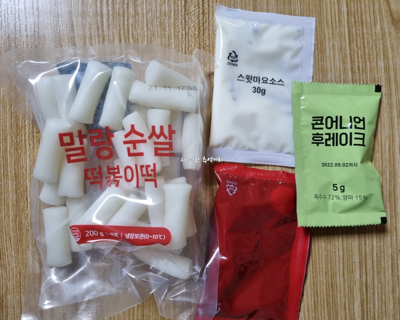 스윗마요 떡볶이는 말앙 순쌀 떡볶이떡과 마늘떡볶이소스, 스윗마요소스, 콘어니언후레이크 가 들어 있었다.