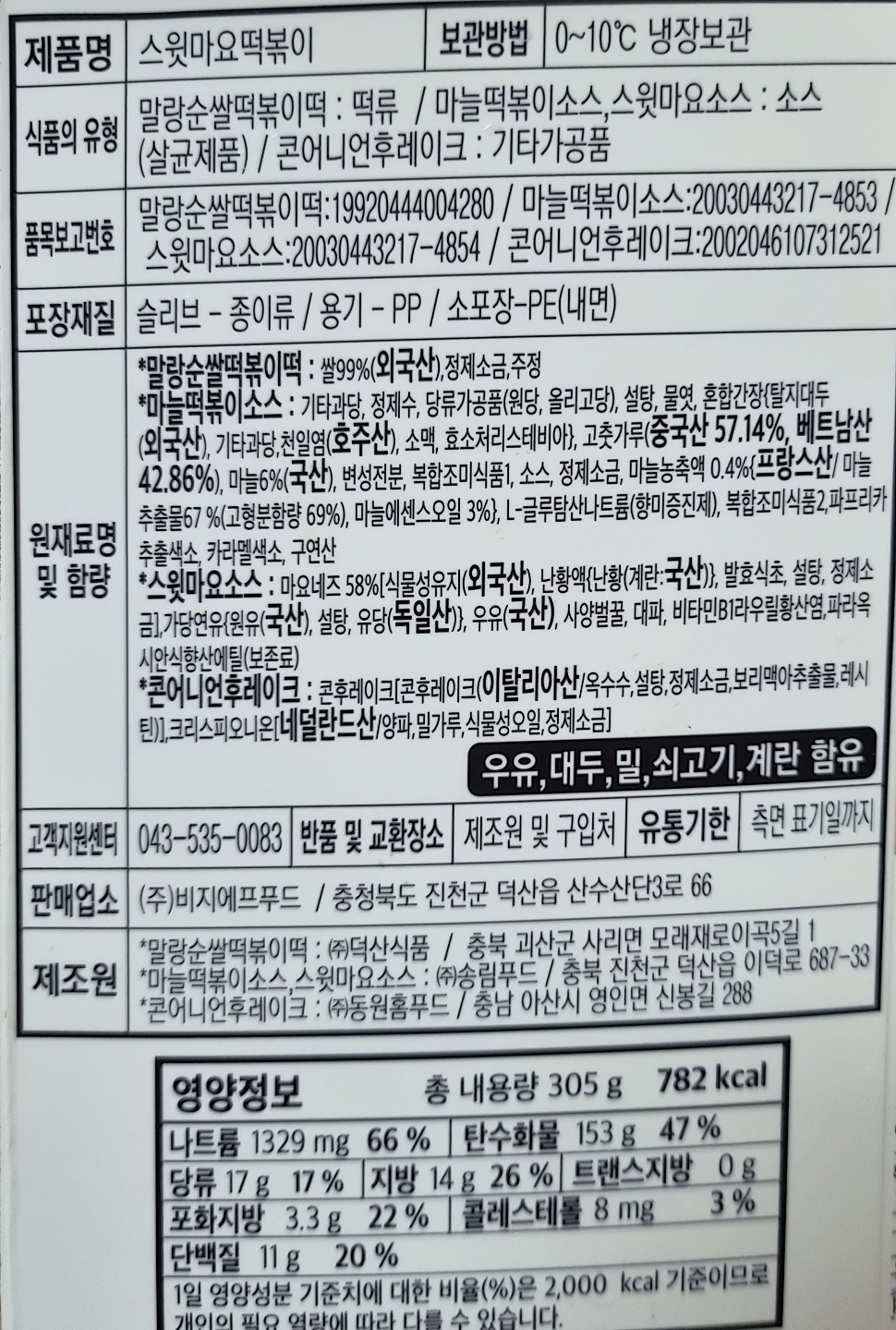 스윗마요 떡볶이 영양정보는 총 내용량은 305g, 782kcal , 나트륨 1329mg (66%), 탄수화물 153g(47%), 당류 17g(17%), 지방 14g(26%), 트랜스지방 0g, 포화지방 3.3g(22%), 콜레스테롤 8mg(3%), 단백질 11g(20%)