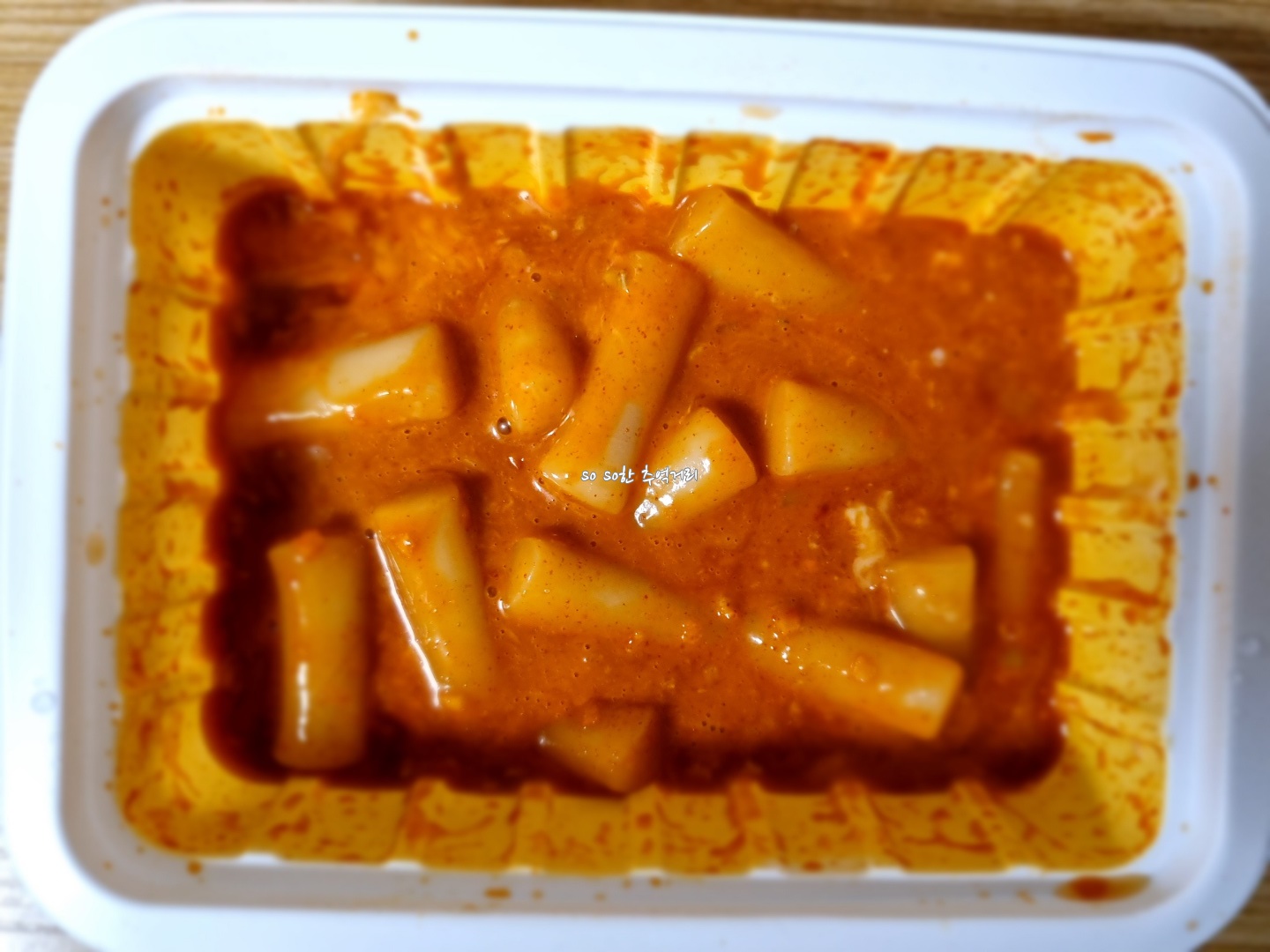 뜨거운 물을 부은후에는 소스와 떡을 잘 섞어 준다. 용기에 슬리브를 끼운뒤 전자레인지에 4분(100W)이나 4분 30초(700W) 정도 돌려준다.
