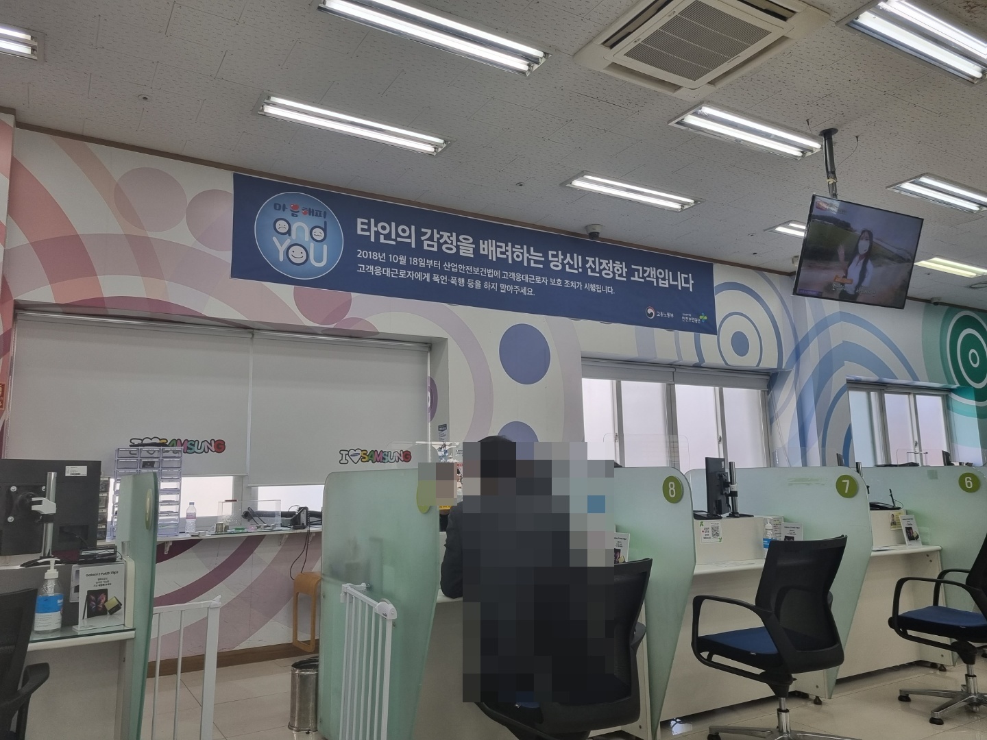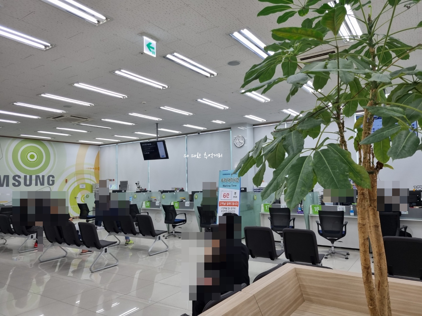 삼성전자서비스센타 강동점 3층은 꽤 넓었다. 한쪽은 핸드폰이나 버즈가 진열 되어 있어서 직접 구경하고 체험 할 수 있는 곳이었다. 난 서비스센타에 들어 왔기때문에 그곳을 들어가보지는 못했다. 아마 코로나가 아니였음 통할 수 있는 곳이었는데 코로나로 칸막이를 해놓은 것 같다.