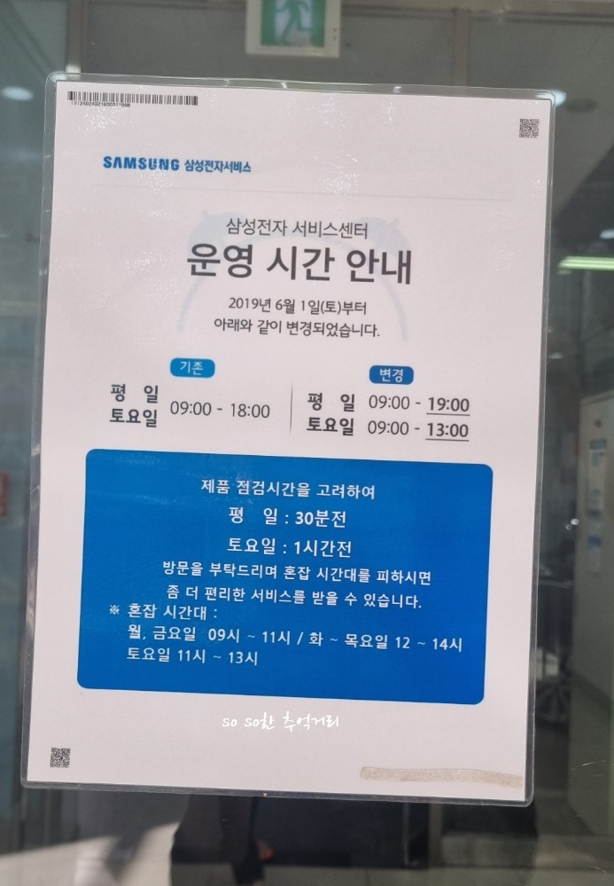 입구에는 삼성전자서비스 센터 강동점의 운영시간이 붙어 있었다. 내가 사진을 이렇게 찍은건지 아니면 이렇게 붙어있는걸 찍어서인지 사진이 삐툴하다. ㅠ