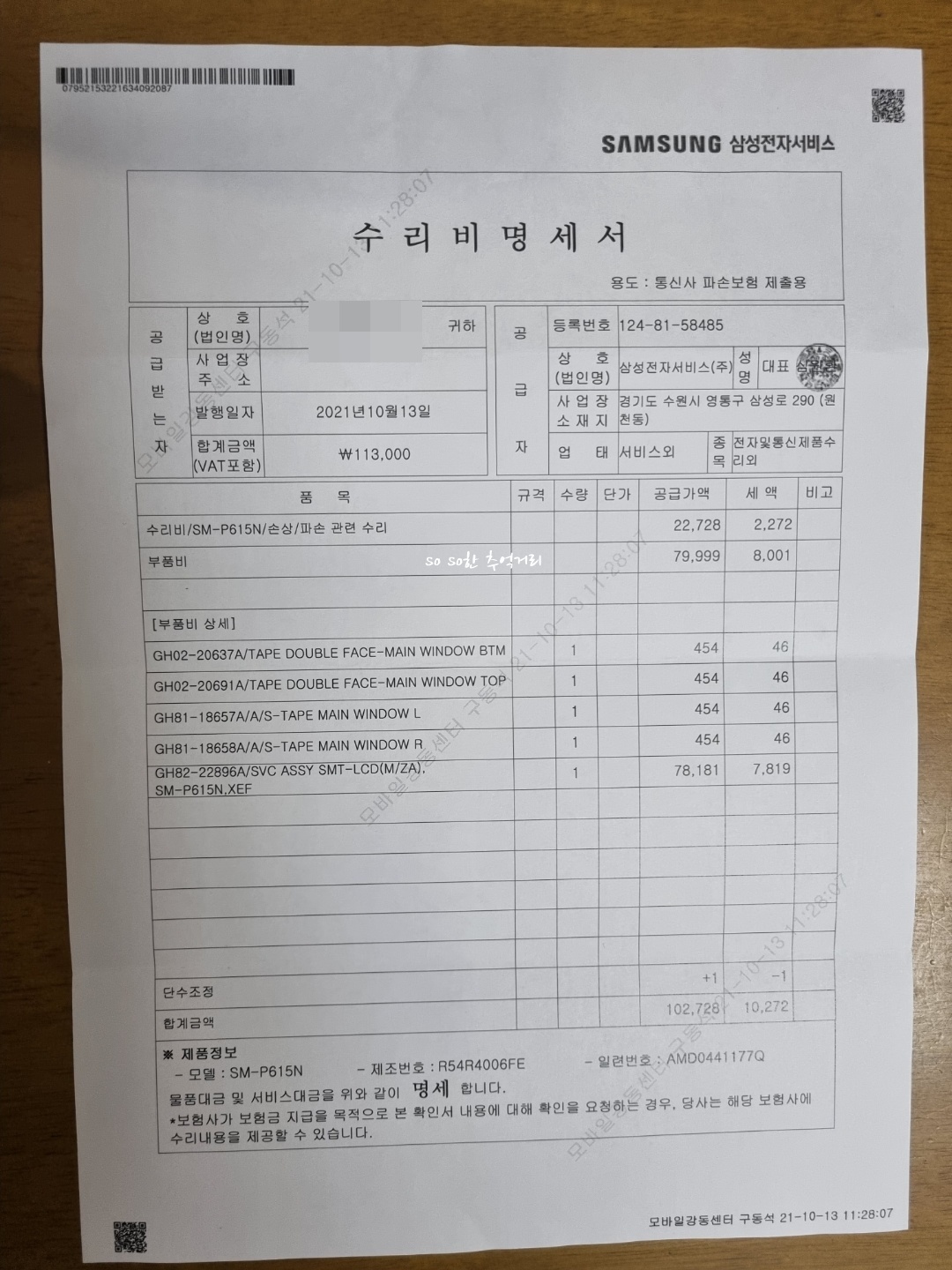 혹시 몰라 수리비 명세서를 받아 왔다. 아니나 다를까 딸아이가 보낸 준 서류에 수리비 명세서와 영수증이 필요하다고 쓰여 있었다. 다행이당... 삼성전자 서비스 센타에 가려면 넉넉히 시간을 잡고 가는게 좋을 것 같다. 입장하는 시간 , 기다리는 시간, 수리하는 시간까지 잡고 가야한다.