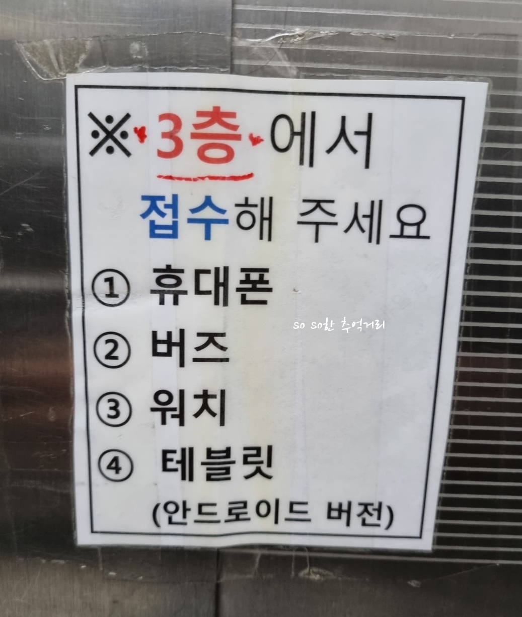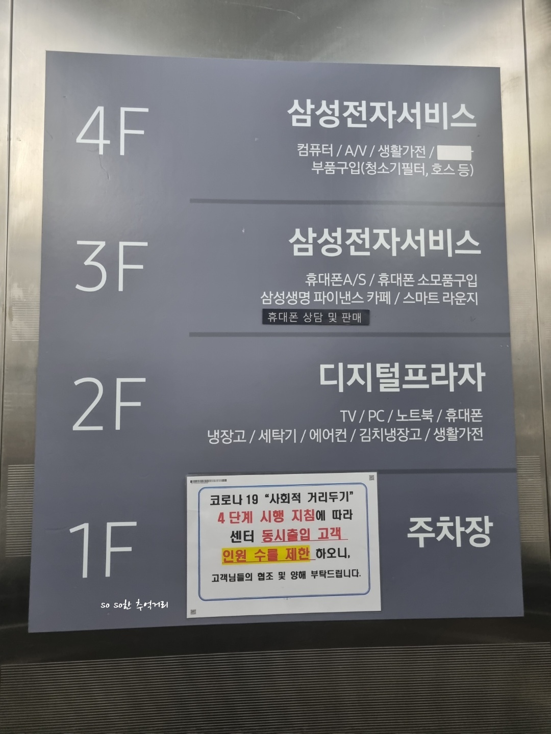 그리고 엘리베이터를 타고 내려오는데 아까는 사람들이 있어서 가려져 보지 못한 메모가 있었다. 삼성전자서비스센타 강동점은 휴대폰, 버즈, 워치, 테블릿은 3층에서 접수해야 한다고 하니 참고하면 좋겠다..