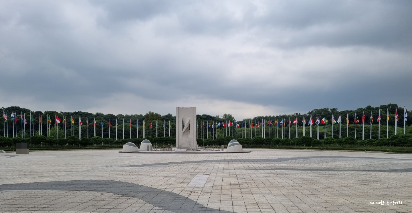 평화의 문과 마주보고 있는 올림픽공원 국기 광장이다 . 1988년 서울 올림픽에 참가헀던 160개 참가국의 국기들이 게양 되어 있는 공간이다. 국기대가 둘러싸고 있는 가운데에 있는 조형물은 당시 참가국이 가져온 돌을 박은 조형물이라고 한다. 각 나라의 명패가 조형물을 둘러 설치되어 있다.