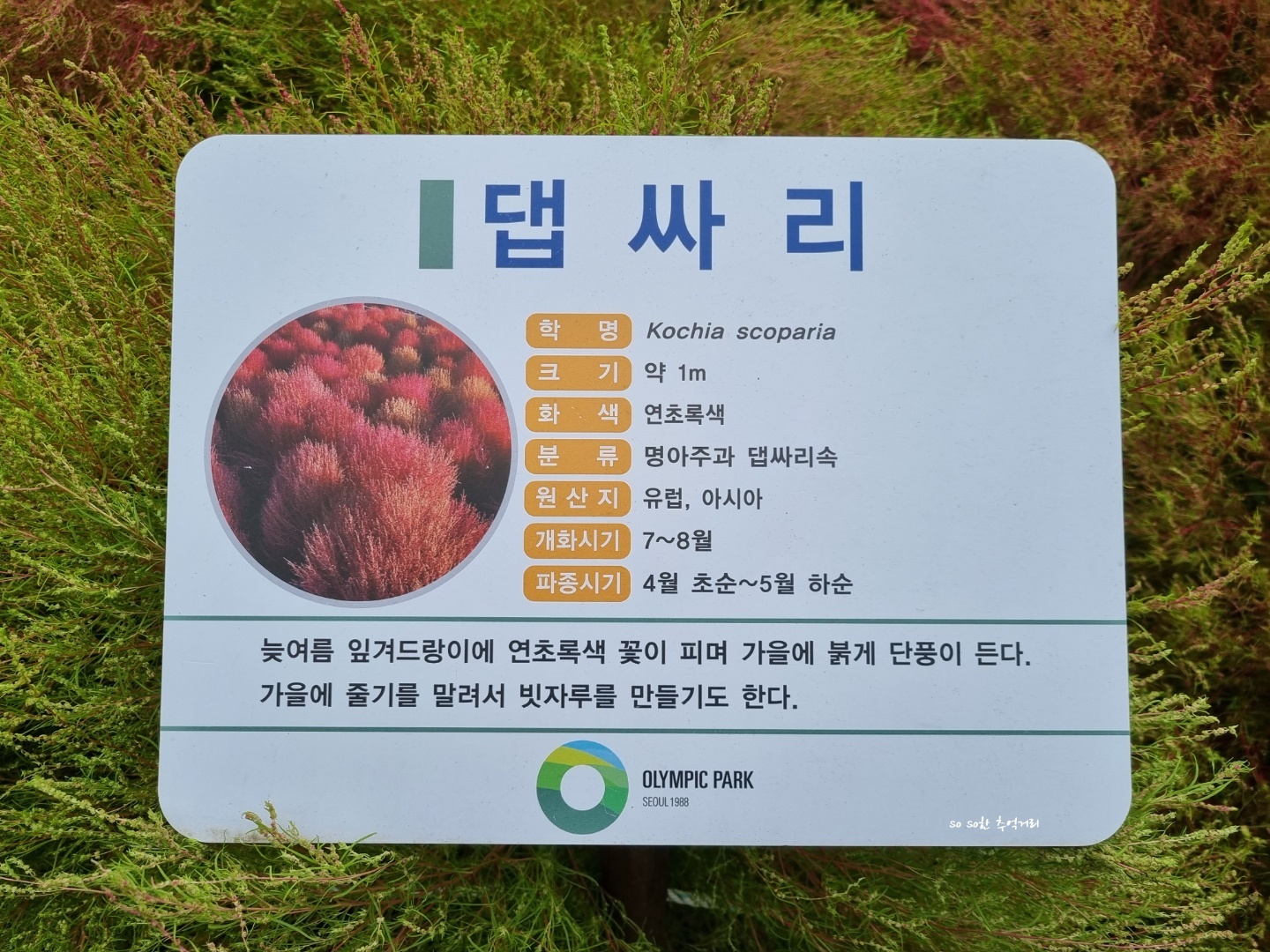 올림픽공원에 있는 댑싸리다. 사실 이름도 첨 들어보긴 한다. 가끔 구독자님들 블로그에서 보았던 기억이 나서 사진을 찍었다. 그런데 아직은 완전 붉게 단풍이 들지 않아서 연초록색 빛이 점점 붉은색으로 단풍이 들고 있는 중이었다.