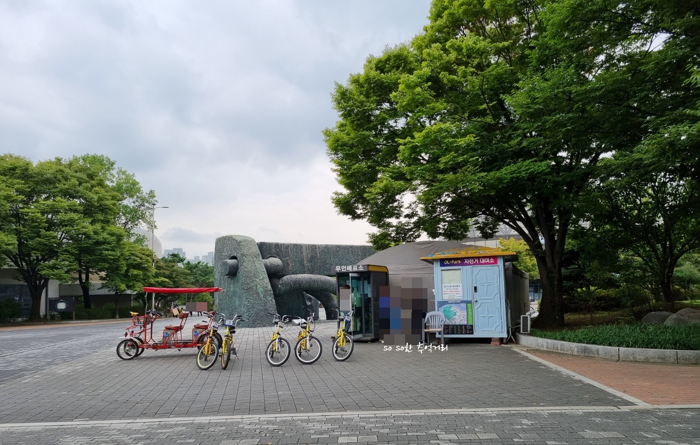 올림픽공원에 오면 4륜 자전거나 1인용 자전거도 대여할 수 있다. 올림픽공원이 넓기 때문에 자전거를 이용해서 다니는 것도 좋은 방법이기도 하다.