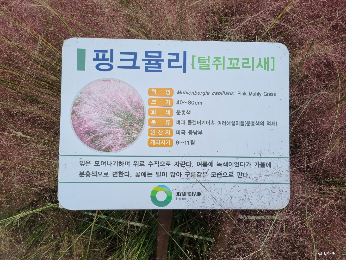 핑크뮬리는 털쥐꼬리새라고도 한다. 원산지는 미국 동남부이고 잎은 모여나기하며 위로 수직으로 자란다. 여름에는 녹색이었다가 가을에 분홍색으로 변한다. 꽃에는 털이 많아 구름같은 모습으로 핀다. 실제 멀리 보니 분홍 구름이라고 표현을 하면 딱 맞는 것 같았다.